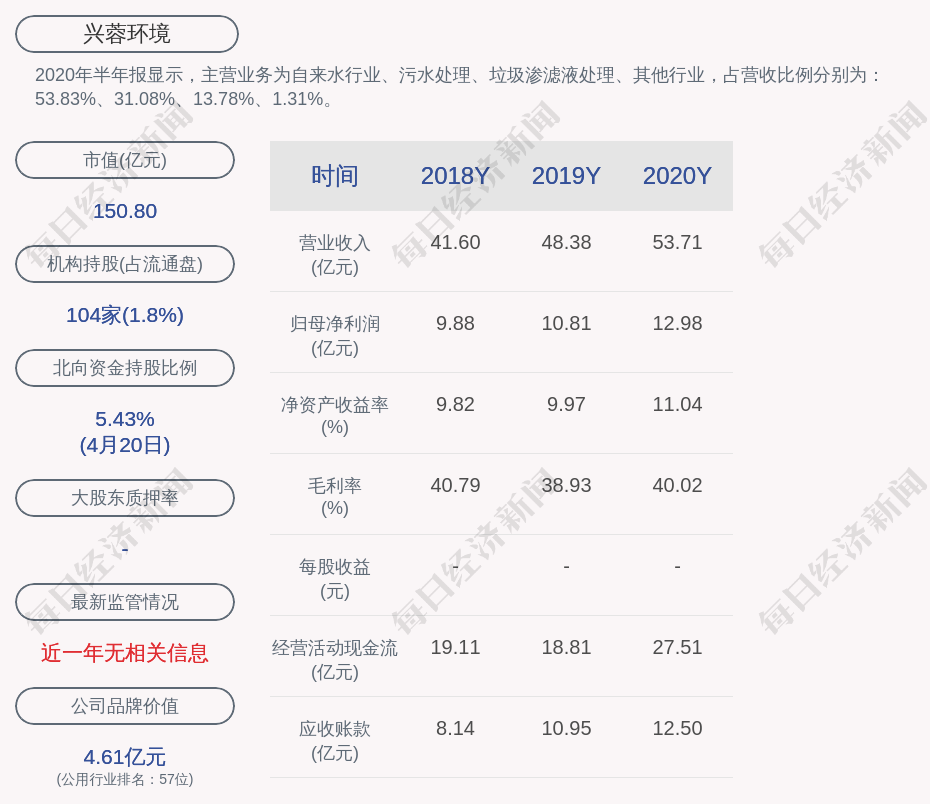 2020年半年報顯示,興蓉環(huán)境的主營業(yè)務(wù)為自來水行業(yè)、污水處理、垃圾滲濾液處理、其他行業(yè),占營收比例分別為:53.83%、31.08%、13.78%、1.31%。
