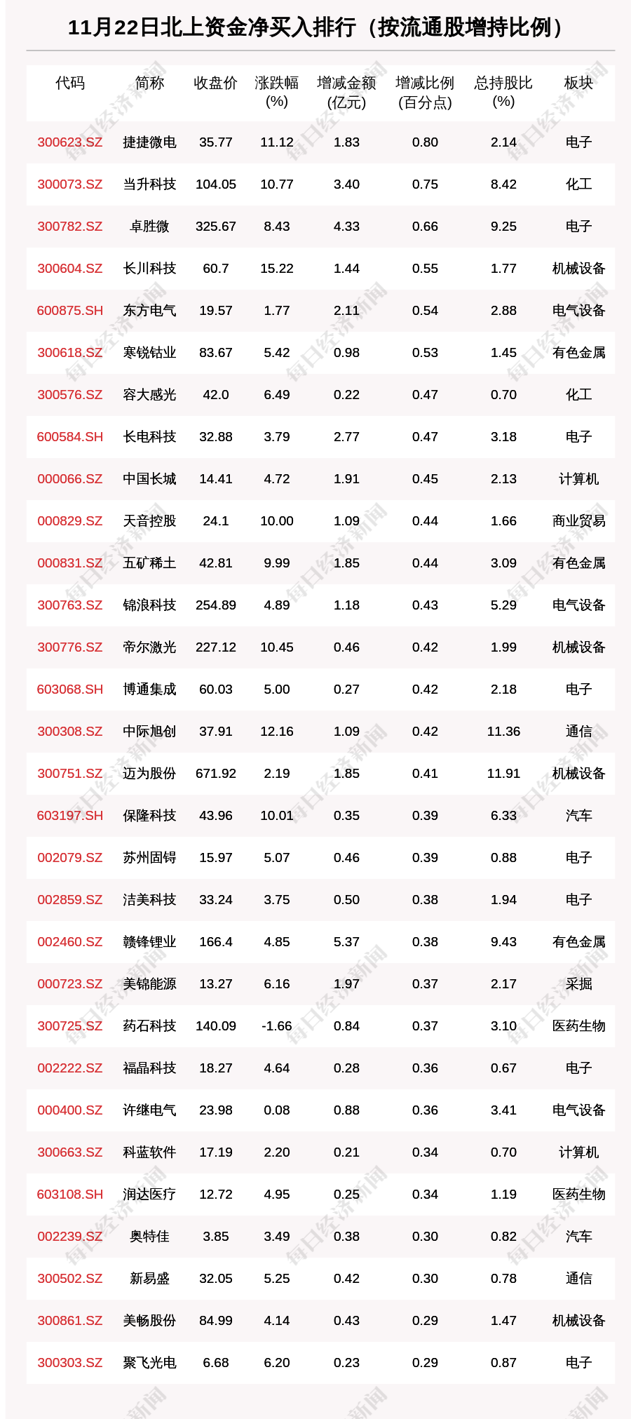 每經(jīng)AI快訊,11月22日,北上資金凈買入的個股共有553只,北上資金加倉比例超1%的有435只。其中,捷捷微電(300623.SZ,收盤價:35.77元)加倉比例最為明顯,最新持股比例2.14%,環(huán)比增加0.80個百分點。其他北上資金加倉比例較多的個股還包括當升科技(300073.SZ,收盤價:104.05元)、卓勝微(300782.SZ,收盤價:325.67元)、長川科技(300604.SZ,收盤價:60.7元)。