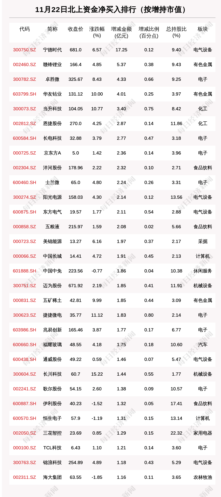 11月22日,按照北向資金增持市值排序,寧德時代(300750.SZ,收盤價:681.0元)增持市值最大,增持市值17.253億元,環(huán)比增加1.43%。其他北上資金增持市值較多的個股還包括贛鋒鋰業(yè)(002460.SZ,收盤價:166.4元)、卓勝微(300782.SZ,收盤價:325.67元)、華友鈷業(yè)(603799.SH,收盤價:131.12元)。