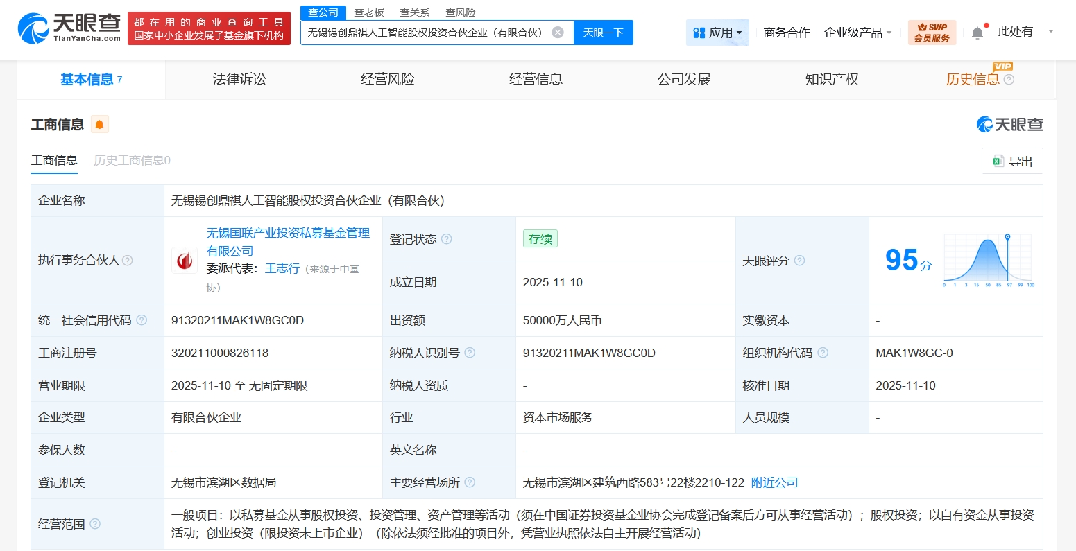 每經(jīng)AI快訊,天眼查工商信息顯示,近日,無錫錫創(chuàng)鼎祺人工智能股權(quán)投資合伙企業(yè)(有限合伙)成立,執(zhí)行事務(wù)合伙人為無錫國聯(lián)產(chǎn)業(yè)投資私募基金管理有限公司,出資額5億元人民幣,經(jīng)營范圍為以私募基金從事股權(quán)投資、投資管理、資產(chǎn)管理等活動,股權(quán)投資,以自有資金從事投資活動,創(chuàng)業(yè)投資。合伙人信息顯示,該合伙企業(yè)由無錫市創(chuàng)新投資集團有限公司、無錫鼎祺科創(chuàng)投資合伙企業(yè)(有限合伙)、無錫數(shù)據(jù)集團有限公司等共同出資。