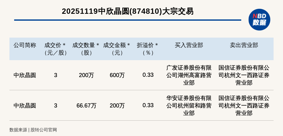 每經(jīng)訊,2025年11月19日,新三板創(chuàng)新層公司中欣晶圓(874810,收盤價(jià):2.99元)發(fā)生2筆大宗交易,總成交金額為800萬(wàn)元,成交金額最高的一筆成交價(jià)3元/股,成交數(shù)量200萬(wàn)股,成交金額600萬(wàn)元,溢價(jià)0.33%。買入營(yíng)業(yè)部是廣發(fā)證券股份有限公司湖州高富路營(yíng)業(yè)部,賣出營(yíng)業(yè)部是國(guó)信證券股份有限公司杭州文一西路證券營(yíng)業(yè)部。